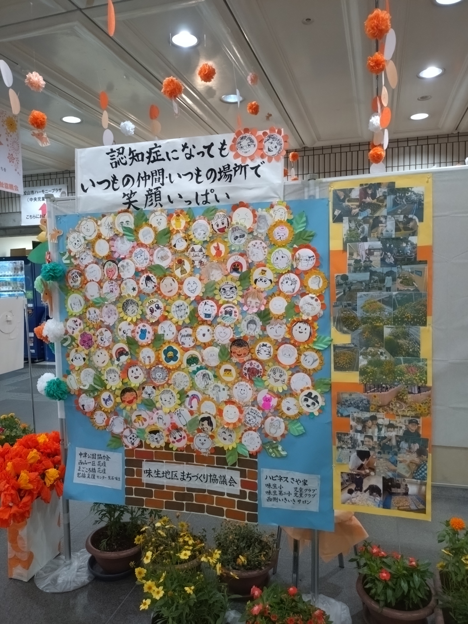 公開日 2026/1/22 お知らせ活動報告 環境部 令和7年度「オレンジガーデニングプロジェクト」参加 今年も 松山市社会福祉協議会が行う「認知症理解啓発事業~9月は世界アルツハイマー月間です~」に参加しました。味生地区の8団体にご協力いただき、紙コースターに笑顔を描いたオレンジの花がたくさん集まりました。 この笑顔いっぱいの作品は、マリーゴールドのプランターと一緒に、期間中、松山市総合福祉センター1階ロビーに展示されました。